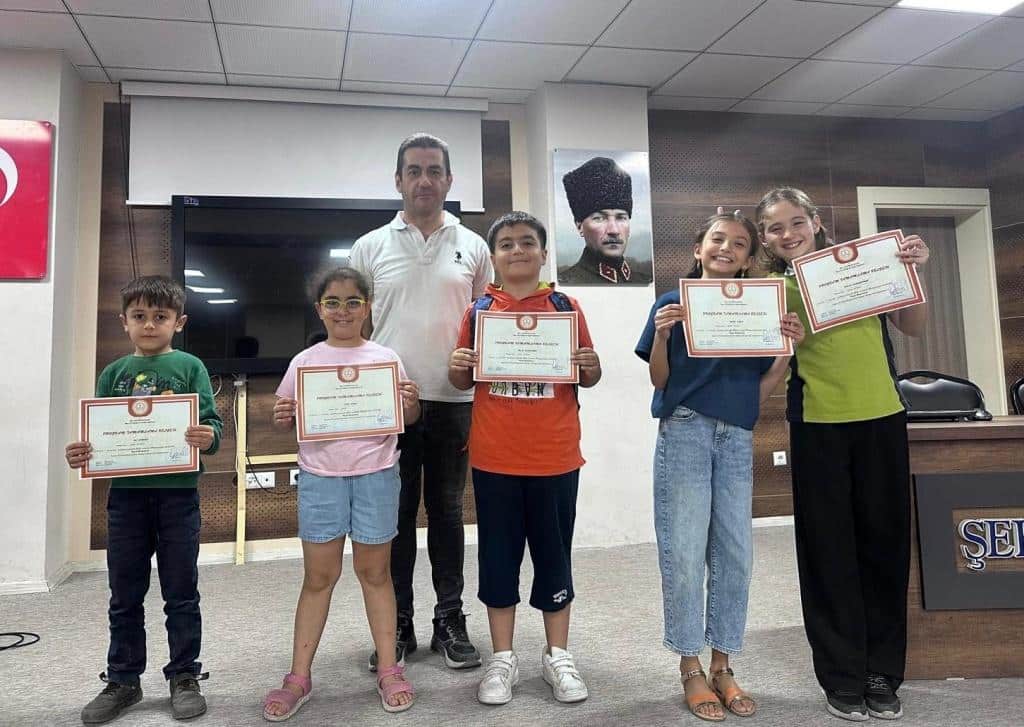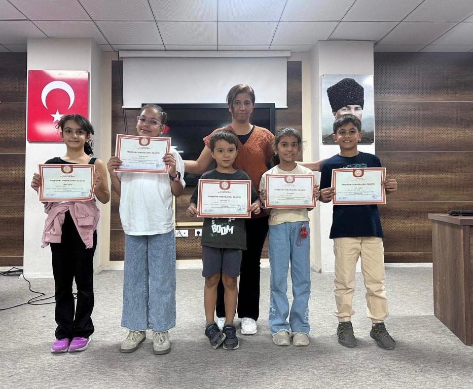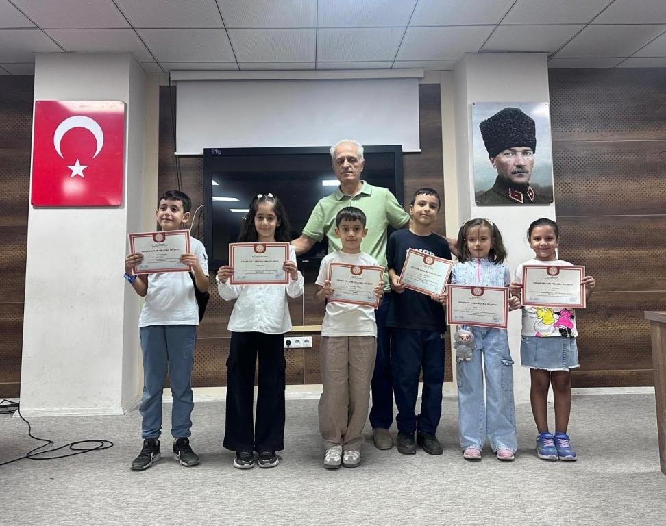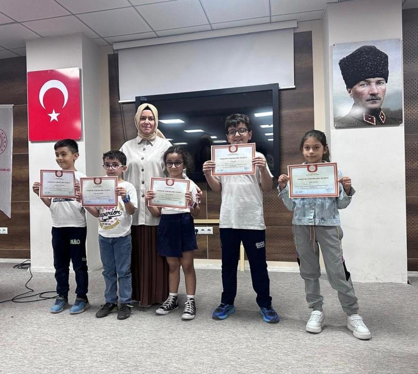 Belge töreninde öğrencilere katılım belgeleri takdim edilirken, aileler de çocuklarının heyecanına ortak oldu.